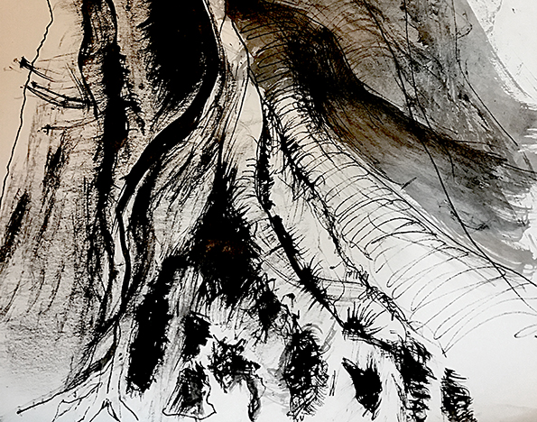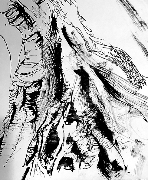 Using a dipping pen and Chinese ink I started looking at the different ways that I could depict the different textures that the bark had acquired over the years.