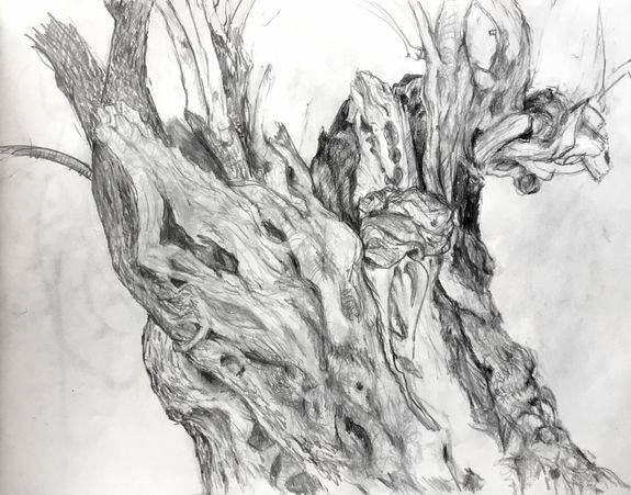 I knew I had found my muse. I began sketching her gnarled and twisted limbs, the warp-and-weft of her tangled roots, her tattered amputations and her many textures. Working in her presence, I found that I could only tackle small parts of the complex labyrinth of branches and roots, and only for short stretches of time. Every nuanced texture contained centuries of history, palpable and overwhelming.